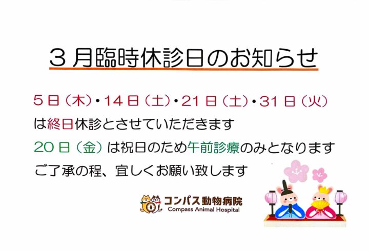 また、20日(金:春分の日)は祝日のため午前診療のみとなります
